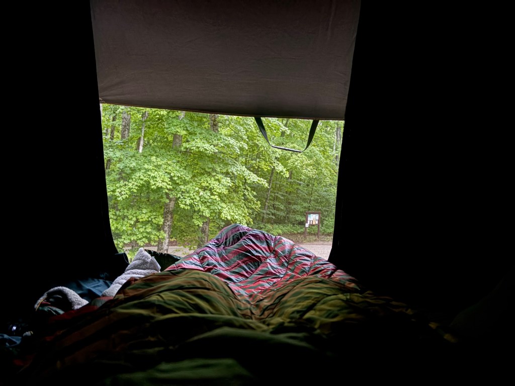 One particular oversight, I had planned to use my 110v/400w AC outlet to charge my ecoflow battery that I hook my fridge up to. Little did I know that the outlet only works when the truck is in park. In my first full day on the road I had to find a campsite with power to recharge my battery. No big deal but it changes my logistics. You can get almost three days worth of charge btw with the fridge. I foresee a solar panel in my future for my battery so I don’t have to depend on full hookups. I was off grid in the upper peninsula of Michigan for two days so I kept one eye on my battery charger keeping my fridge with $105 worth of groceries in it. It did its job. I griddled a bacon cheeseburger with onions my first night, made some steak and eggs for breakfast the next morning and enjoyed a hot bowl of ramen with chicken under my awning as a cool rain drizzled for most of the night.